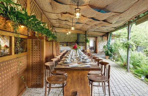 This level features a spacious dining room with seating for 20, an equipped professional kitchen, a utility room, and two bathrooms equipped with a WC and sink.
