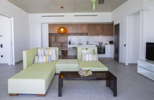 It has a spacious and comfortable living room with an open plan fully equipped kitchen and a dining area where you can enjoy a meal with your loved ones. The living room offers a wonderful panoramic view to the pool and sea, due to its large window doors.