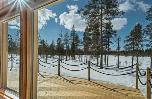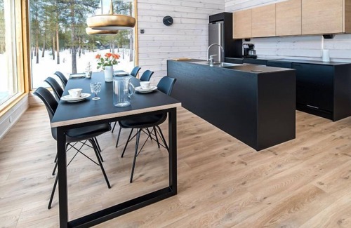There are two saunas available for guests. In addition to electric sauna, there is an atmospheric log sauna located in the yard. Access to the log sauna is from glazed terrace. Utility room for laundry maintenance. You can admire the magnificent fell landscape from the large open terrace. Car shelter for car and storage for sports equipment. Large windows will open you a magnificent view to the nature of Lapland. When you are sitting in the living room, you can feel to be an inseparable part of the beautiful view. The stars and northern lights can be comfortably observed from inside the villa, from the glazed or open terrace. Lighting in Villa Gaissa is designed to change from one atmosphere to another.