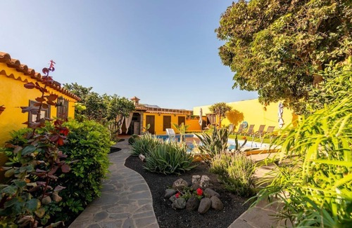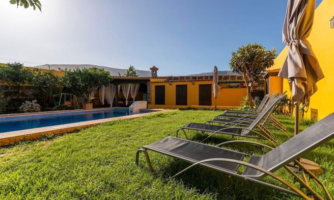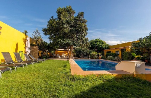 Villa with private pool, large garden, large leisure area, barbecue and parking in a tranquil area 5 minutes by car from the town centre.The Villa offers the guest a comfortable home with a capacity for ten people, four bedrooms with a double bed, a comfortable sofa bed in the main living room, four bathrooms, a fully equipped kitchen, a private pool, 700 meters of the plot with various trees fruit trees, solarium and barbecue area. This property allows you to stay in Gran Canaria, independently and privately, with all kinds of comforts. The house is equipped to the smallest detail. House with wooden ceilings and high-standard decoration. Among some items of equipment are a large refrigerator, chest freezer, dishwasher, air conditioning, terrace furniture, maximum speed Wi-Fi internet, parking within the plot with capacity for four cars, barbecue and kitchen attached to the same.The property is completely private, there are no shared services.Galdar is a town in the north of Gran Canaria with all the necessary services to enjoy a pleasant stay in Gran Canaria. Supermarkets, restaurants, shops of all kinds, pharmacies, health centers, etc... The location is 5 minutes by car from the town centre.To access the villa and move around the area, it is best to have your own vehicle. It is a quiet area that does not have a public bus service to the house. If possible, use the taxi service of the town of Galdar