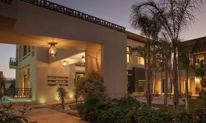 Magnificent "Art Déco" villa, with house staff. Large swimming pool, heated jaccuzi with outside beds and landscaped garden. Fitness room. 5 bedrooms. Stunning view of the Atlas mountains. Large terraces. Breakfast are included and served at the table. Preparation of lunches and dinners on request. Less than 5 minutes you will find indoor and outdoor paddles, tennis, quads, horses, camels, water-ski. Buggys rental at Agafay desert on request.