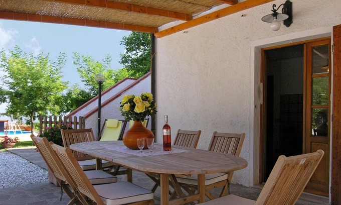 Villa Geranio is surrounded by its enormous and beautifully kept garden with lawns. A fabulous pergola patio equipped with charming wooden table and chairs perfect for al fresco dining and a veranda with a comfortable sitting area, ideal for relaxing and enjoying the essence of the countryside whilst sipping an aperitif. The charming stone built barbecue is perfect for roasting the local meat and the wood-fired oven for baking pizzas. Close by, in the grounds is a wonderfully large swimming pool (4m x 9m) surrounded by beautiful green lawns, with sun beds, deckchairs and sun umbrellas to relax in and admire the captivating views of the rolling hills.