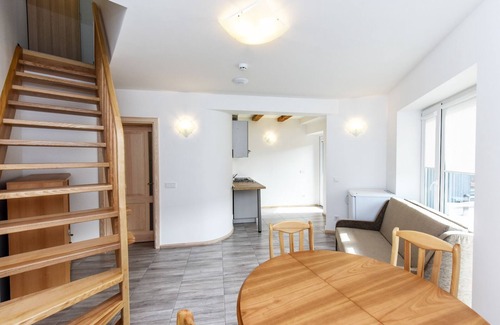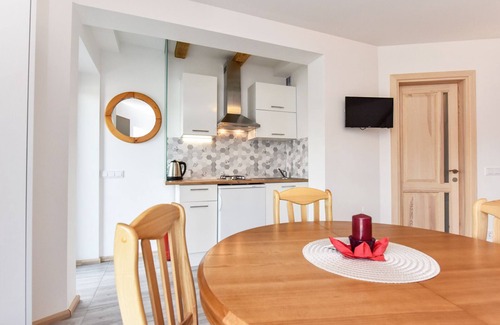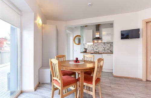 Each Apartment in our Vila is on the first to second floor, with a separate independent entrance and a patio with outdoor furniture. On the first floor there is a living room with an integrated kitchenette (in the kitchen area you will find a fridge, a stove, a kettle, dishes and cooking utensils) and a spacious bathroom (shower, WC,