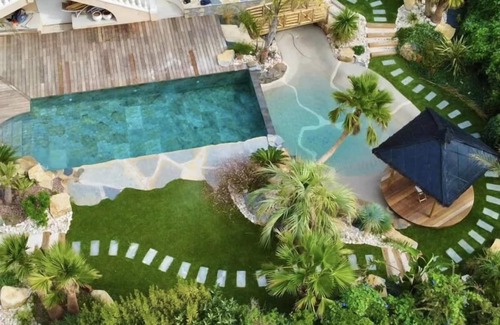 Outside beckons relaxation with a lagoon pool, heated upon request from May to the end of September, and its landscaped garden where palm trees caress the sky. Luxury continues in a cinema room with a bar, for evenings in complete tranquility – the villa prioritizing peace and prohibiting noisy festivities out of respect for the neighborhood.