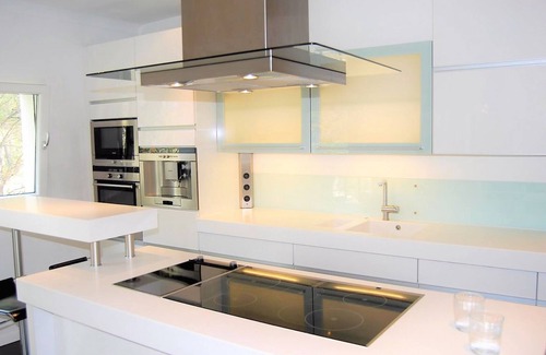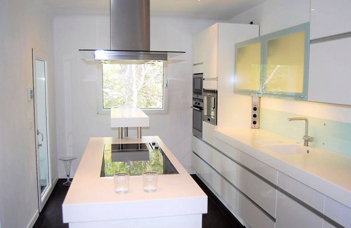 The interior design is sleek, modern and characterized by exclusive designer furniture, as well as various paintings by the artist Bettina Nuschei. The exterior glass elevator transports guests to the different levels of the villa. The first stop leads to a lounge with open-air fireplace.