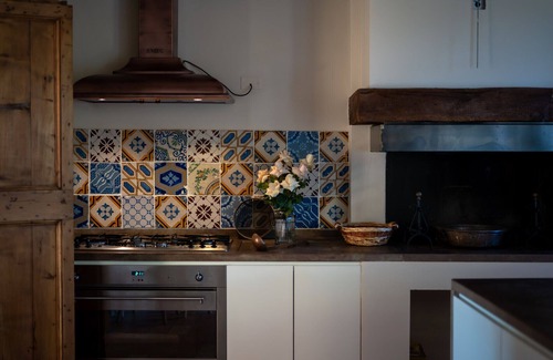The entrance to the main building opens onto a large central hall where a striking original 1920s billiards stands out in the background. To the left of the living room you will be welcomed by a large dining room and another living room with a stone fireplace while on the right you will find a beautiful kitchen. On the first floor you will find five bedrooms, three private bathrooms and a large common bathroom. Finally, a splendid suite with a view has been created in the attic. The two separate outbuildings, on the other hand, can comfortably accommodate other guests. One consists of a spacious living room with two comfortable sofas, a small study with desk, a large kitchen with dining table, two bedrooms and two bathrooms; the other one has a large living room, with a beautiful fireplace that hides the kitchen in an original way, a sofa and a dining table. Two bedrooms and two bathrooms, then, complete the whole. The rooms of the house are spacious and to be lived with exposed wooden beams, brick walls and terracotta floors. The furnishings with very original touches and unique details are highly refined. In the sleeping area the floor with large wooden boards gives warmth and welcome to the guests while the high ceilings and the numerous windows offer brightness and airiness to the spaces.