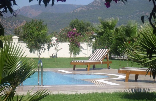Lale Evi has a private pool(10m x 5m) and an extensive garden(1,600m2). The garden is lawn with palm trees, pomegranate trees, banana palms and oleander shrubs. Inside, the cottage is spacious, with lounge, open plan kitchen, bathroom and a double bedroom on the ground floor. Upstairs are two further bedrooms, one double and one twin, and a second bathroom. The double bedroom has small private balcony with views of fields and mountains. The upper floor of the cottage has attic style sloping wooden ceilings and both bathrooms are individually designed with marble fittings hand made by local craftsmen. All bedrooms and the lounge have air conditioning. We have been adopted by a cat and hope you will be willing to feed her. The Dalyan area has been awarded the status of a Turkish National Park and is an exceptionally beautiful area. The beaches are protected as they are where the endangered loggerhead sea turtles lay their eggs in the summer months. Dalyan has a lively town centre with a great choice of restaurants and bars. We recommend a car and can put you in touch with a local (english speaking) company who offer car rental and airport transfers which our guests tell us is great value for money and they offer a great service.