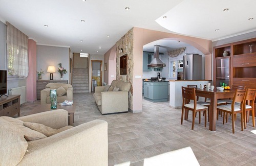 This spacious villa offers a perfect retreat for families, with accommodations for up to 9 guests. The property features five comfortable bedrooms, including a double bedroom and four rooms with twin single beds. The villa boasts a private swimming pool with beautiful sea views, an ideal space to relax under the sun. The villa is equipped with modern amenities like satellite TV, a fully equipped kitchen with a microwave, oven, dishwasher, and washing machine. The property also allows pets upon prior request for an additional fee, making it a great option for pet owners. Parking for one car is available on-site. The villa is situated in a quiet residential area, just 5 km from the tranquil beach of Canyelles, 6 km from the lively town center of Lloret de Mar, and 7 km from the charming medieval town of Tossa de Mar. Visitors can enjoy beautiful walks along the coastline, explore local cafes, and dine at nearby restaurants offering delicious Mediterranean cuisine. The area is perfect for families looking to enjoy the natural beauty and rich culture of the Costa Brava. Inside, the villa offers a fully functional kitchen for preparing meals, while two bathrooms—one with a bathtub and one with a shower—ensure convenience for guests. For additional comfort, heating is available for an extra charge. A lovely outdoor barbecue area is ideal for dining al fresco, and the property also features a terrace with stunning views of both the sea and mountains. The villa provides a peaceful escape while being close to local attractions and essential amenities.