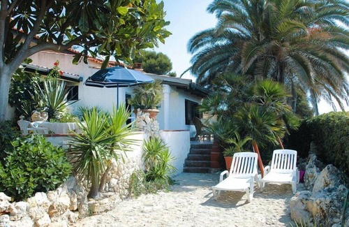 Directly on the turquoise water only 20 m from the sea! Spacious holiday villa on the Fontane Bianche bay, with stunning views of the sea. Shady trees and palm trees grow on your 400 square meter garden/nature property. In the bay in front of your house, rocky sections alternate with light sandy beaches, the nearest sandy beach is only 3 kilometers away from the house. The small town is not an independent municipality, but is attached to Syracuse. Activities nearby : Visit Syracuse, one of the most famous cities in Sicily. Here, Greek culture mixes with Italian temperament. Historical sights such as the Apollo Temple, built in 600 BC and the Roman Amphitheater should not be missed. In the narrow streets of the old town and in the listed harbor district you can stroll wonderfully. Interior: The detached house has two floors which are functionally furnished for four people. The approximately 90 square meter living space on the ground floor is reached by five outside steps and offers a living room with upholstered furniture, a fireplace and a flat screen with satellite TV. The habitable kitchen has a four ring gas hob, electric oven, dishwasher, toaster and microwave. An espresso machine (classic espresso maker) available. Bathroom with shower/toilet/bidet and another separate toilet with toilet. The washing machine is in the storage room. A staircase leads to the night area on the first floor. On the right is the double bedroom with air conditioning and window, on the left a small single bedroom with single bed and another small single bedroom with single bed, window and air conditioning. All windows of the house have mosquito nets and of course sea views which bring a natural painting into the room. Wi-Fi available. Extra bed available on request. Payable on site.Outside a