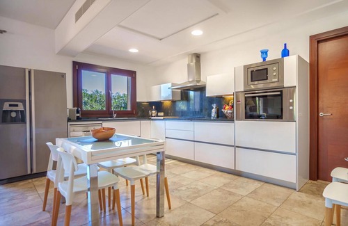 This modern, recently built villa is situated on a tranquil 15,000 m² estate in the serene countryside of northern Mallorca, just 11 km from the beach. Surrounded by natural beauty and a refreshing sea breeze from the Bay of Alcudia, the villa offers an ideal retreat. It is located next to two similar chalets, making it a perfect choice for large groups or families. The villa’s Mediterranean and minimalist design emphasizes large open spaces, plenty of natural light, and high-quality finishes throughout. The villa features a round pool, ideal for a refreshing dip, and an outdoor auxiliary kitchen located next to the pool area, making it perfect for al fresco dining. Inside, the home is equipped with modern, top-of-the-line furniture and appliances, including underfloor heating for ultimate comfort. A luxurious hydromassage bathtub is also available for relaxation. Every detail of this villa has been carefully designed to ensure a pleasant and luxurious stay. Pets are welcome, with a maximum weight of 6 kg and a deposit of €100 required on-site. Whether you're relaxing by the pool or exploring the nearby beaches, this villa offers everything you need for a wonderful vacation.