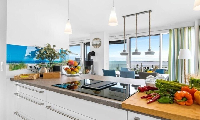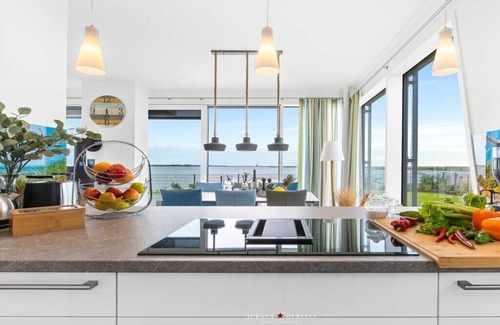 The holiday home Villa Seemööv is located in the newly built Ostsee Resort Olpenitz. Please note that construction is currently taking place on the street side in front of the holiday home. We would be happy to inform you about the current status. As soon as you enter the house through the front door, you are in the entrance area. Next to it is a large bathroom with a walk-in shower. This, like most of the lower level, was planned to be barrier-free. There is also a maritime-style bedroom on this level. It was lovingly designed and is furnished with a 1.80m wide bed, which is equipped with mattresses and pillows from Tempur, a wardrobe and a TV with Telekom Entertain. Finally, the hallway leads to the large, light-flooded living-dining area, in which an open kitchen is integrated. There you will find a breathtaking view that you will definitely not forget in a hurry! Through two large sliding doors you enter the large sun terrace, where you can use a seating area, 2 deck chairs and a beach chair. On the upper floor, which can be reached via a staircase, there are two further bedrooms and two bathrooms.