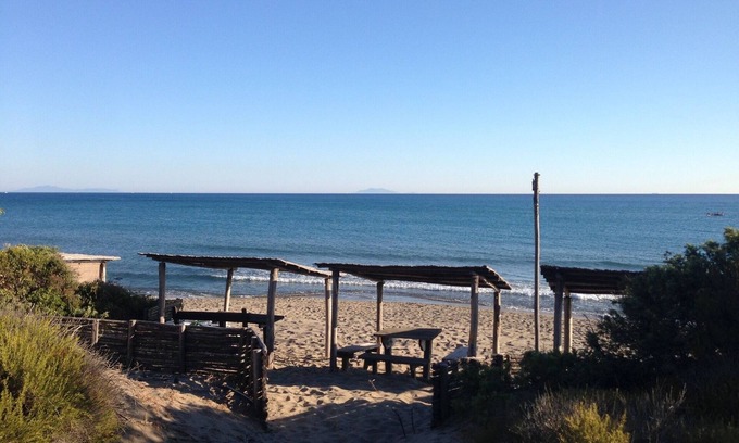 It takes 5 minutes to reach the sea on foot. The beach is equipped with private canopies and reed changing rooms; there are no umbrellas or showers or refreshment stations. Although the beach is not private, it is frequented by residents of the pine forest and therefore uncrowded even during peak periods.