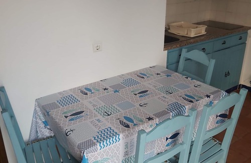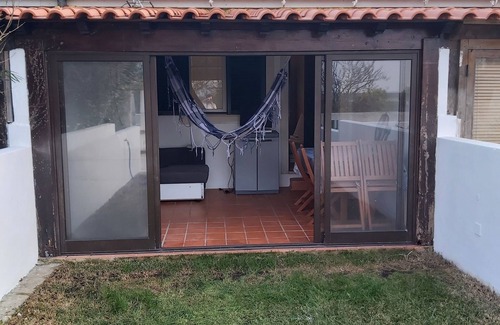 Small villa with a bedroom with a couple bed and a sofa bed. It has a closed terrace with glass doors and a big IKEA sofa bed, a turf garden with barbecue, one bathroom and a kitchen equipped but it doesn't have washing machines.