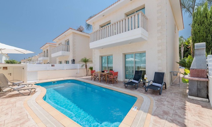 Welcome to Villa Jacqueline, your perfect holiday retreat in the picturesque Amadora complex, nestled in the vibrant heart of Pernera, near Protaras. This charming 3-bedroom villa promises an unforgettable vacation experience with its blend of luxury, comfort, and convenience. As you step into Villa Jacqueline, you'll be greeted by a bright and cozy atmosphere. The living area features a comfortable large sofa and a flat-screen TV equipped with a Satellite TV Box, offering a wide array of international channels. The dining area, with seating for six, and the fully equipped kitchen provide everything you need for a delightful stay. On the ground level, you'll also find a guest WC for added convenience.The second level is designed for relaxation, offering three beautifully appointed bedrooms. The master bedroom boasts a double bed and an en-suite shower, ensuring privacy and comfort. The other double bedroom and a twin bedroom share access to the family bathroom, making it ideal for families or groups of friends.The outdoor area of Villa Jacqueline is where you’ll likely spend most of your time, basking in the sun or taking a refreshing dip in the private pool. When you're ready to explore, the surrounding area offers a myriad of activities and amenities. A short stroll away, you’ll discover an eclectic mix of local and international restaurants, lively bars, shops, supermarkets, and water sports. Marlita Beach, a stunning stretch of sand and sea, is just 800 meters from your doorstep, perfect for a day of sunbathing or swimming.At Villa Jacqueline, we prioritize your comfort and entertainment. Enjoy free high-speed WiFi, air conditioning (with a limited usage allowance), and a satellite TV with multiple channels in different languages. Whether you want to watch your favorite movies, TV shows, or sports events live and on-demand, we have you covered.Our commitment to value means our price always includes air-conditioning, a basic pre-arrival and departure clean, fresh bed linen and towels, high-speed WiFi, and free parking. Please note that we do not accept young groups under the age of 25, ensuring a peaceful and enjoyable environment for all our guests.Book your stay at Villa Jacqueline today and indulge in a holiday where every detail is designed to provide you with the ultimate relaxation and enjoyment. We guarantee you’ll leave with memories to cherish for a lifetime.