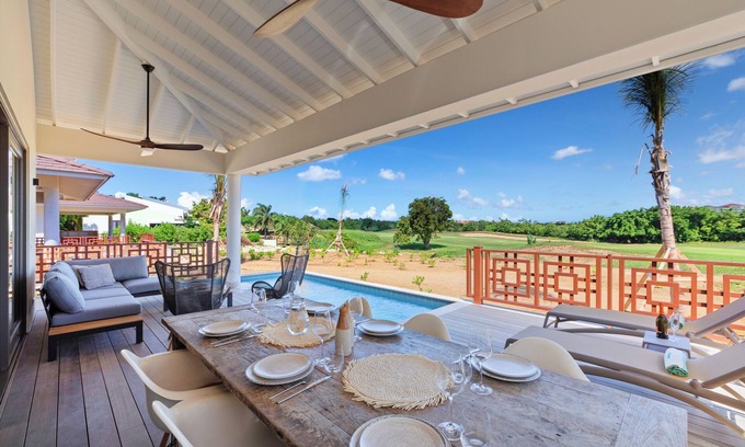 Villa Jazmyn number 18 offers pure relaxation with a breathtaking view. Villa Jazmyn provides a unique experience, directly on the golf course, overlooking lush greenery and flamingos that feel right at home in the area. The villa is designed for ultimate comfort and harmony with nature. Front-row location at the golf course: unobstructed views, peace, and privacy. Three spacious bedrooms, each with a luxury en-suite bathroom. Open and light living space, where indoor and outdoor seamlessly blend together. Large terrace and comfortable lounge areas to fully enjoy the Caribbean atmosphere.