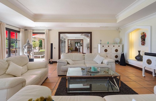 Villa Josepina offers 1049 m² and a stunning view of the Costa d'en Blanes and the marina Puerto Portals. Port de Portals offers many opportunities to eat regional specialities in the numerous restaurants. Bars, nightclubs and shopping facilities are also available. The town is approx. 8 km from the capital Palma and the associated motorway is in the immediate vicinity. The villa, however, is in a quiet residential area. With 5 bedrooms, the air-conditioned villa offers enough space for up to 12 people. 2 of the bedrooms are located in the lower part of the villa. Each with a double bed, one bedroom has an ensuite sauna and 2 further single beds, which is ideal for a family with small children. The villa also has a huge terrace with plenty of seating and dining options, as well as a jacuzzi and barbecue area. The 11 x 4 metre pool can be heated as required and also has a counter-current system. The villa also has a fitness corner with lots of equipment and a large sofa with home cinema system and screen. At present, one bedroom in the basement cannot be used.