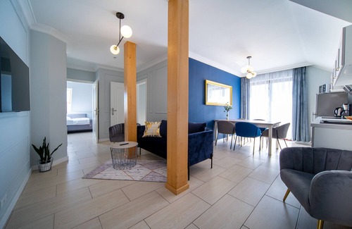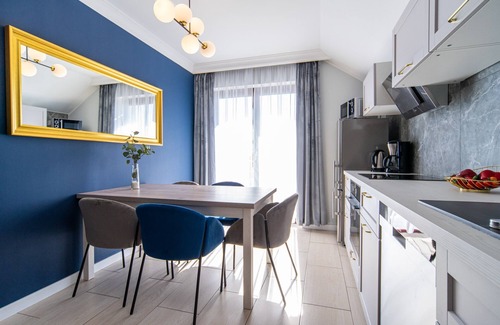 The holiday apartment house Villa Kamila in Miedzywodzie-Zastań with a total of 4 apartments and a guest room was built in 2013 and is located on a lake, Caminner Haff, with access to it. The beautiful white sandy Baltic Sea beach is only about 1800 m away and can be reached in about 3 minutes by car. Each apartment was individually equipped. The kitchens are fully equipped, and even the LED TVs are received by German channels. All apartments are furnished with great attention to detail. Each apartment has its own entrance, two or three rooms, fully equipped kitchen with dining area, either a terrace or a balcony or a direct exit to the private property. Electric window shutters (partially, possibly also electr. Windows), a house intercom and underfloor heating are also part of the equipment.