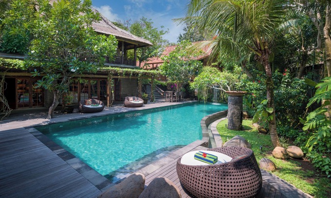 Its well-appointed amenities include a stunning 15m private pool and a waterfall feature, and an open-sided Wantilan-style pavilion with a kitchen, bar and lounge area under a soaring thatched roof and an al fresco dining area. Wellness amenities such as a spa and yoga pavilion ensure a relaxing and holistic stay.