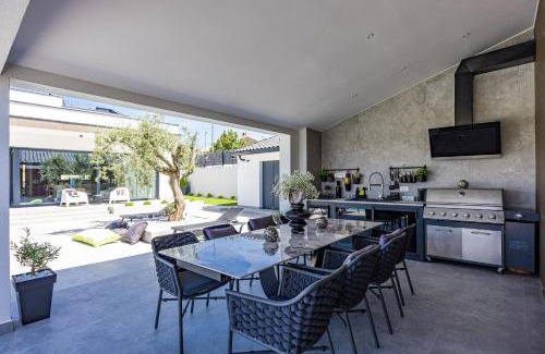 10 miles from Aquapark Istralandia in Momjan, Villa Kim provides accommodations with access to a sauna, hot tub, and fitness room. The property is around 26 miles from San Giusto Castle, 26 miles from Piazza Unità d'Italia, and 26 miles from Trieste Port. There's a seasonal outdoor pool and guests have access to free Wifi, free private parking, and an electric vehicle charging station. Opening onto a balcony with pool views, the spacious air-conditioned villa consists of 4 bedrooms. Providing a terrace with mountain views, this villa also offers a satellite TV, a well-equipped kitchen with a dishwasher, an oven, and a microwave, as well as 4 bathrooms with a shower and a hair dryer. The property has an outdoor dining area. Guests can also relax in the garden. Trieste Station is 27 miles from the villa, while Miramare Castle is 31 miles away. Pula Airport is 52 miles from the property.