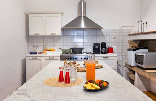 The ground floor is composed of a wide living room with sofas and TV area, a dining room and a fully equipped kitchen with oven, fridge-freezer, microwave, dishwasher, espresso and drip coffee makers, toaster, kettle and a big fireplace.