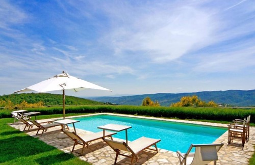 Villa La Piaggia is situated in a very quiet position, at 5 km from Civitella della Chiana and 25 kms away from the centre of Arezzo. The small village maintains the characteristics of ancient times and you can find a typical restaurant and some small shops there. The house and pool in panoramic position overlook the whole valley with Monte S. Savino (15 kms) in the distance. The villa is furnished with rustic, Tuscan furniture which is well combined with other pieces in ethnic style. The property is reachable through an uncovered road, which is nevertheless in good conditions and approximately 2,5 kms long. Very beautiful, cosy farmhouse "La Piaggia", 350 m a.s.l., detached, renovated in 2000. 25 km from the centre of Arezzo, 50 km from the centre of Siena, in a secluded, quiet position on top of a hill. Private: garden 900 m2 (fenced), swimming pool (5 x 10 m, depth 140 - 250 cm, seasonal availability: 27.Apr. - 12.Oct.). Outdoor shower, garden furniture, barbecue. Heating to be paid on the spot, heating available only from 01.Nov. - 07.Apr.. Motor access to the house (2.5 km via unmade road). Parking on the premises. Shop 5 km, grocery 5 km, supermarket 12 km, restaurant 5 km, bus stop 5 km, thermal baths "Rapolano Terme" 30 km. Tennis 20 km, riding stable 15 km. Nearby attractions: Civitella in Val di Chiana 5 km, Monte San Savino 16 km, Castelnuovo Berardenga 28 km, Rapolano Terme 30 km, Gaiole in Chianti 40 km.