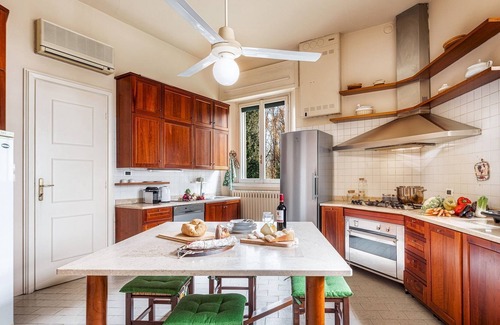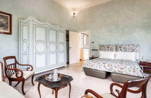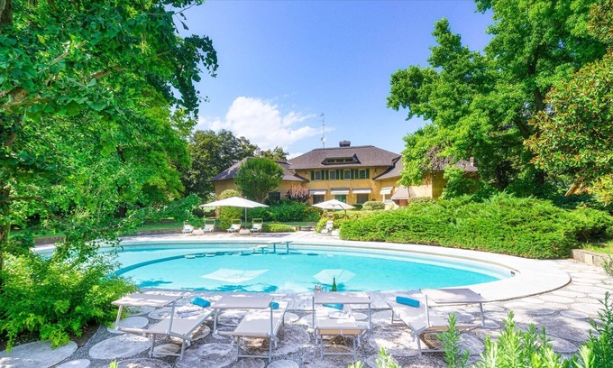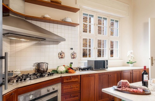 Access to Villa la Pioppa is through a grandiose entrance with wrought iron gate that leads to the tree-lined drive facing the entrance to the villa. The courtyard leads to the villa entrance which is set in a central position; from here you proceed to the living area, to the ground floor sleeping area composed of two bedrooms with relative bathrooms and to the staircase leading up to the first floor with the other bedrooms. From the entrance, you proceed to the living room featuring an imposing emerald green majolica stove set in the centre of the room, surrounded by sofas, tables and armchairs overlooking the pool and the park. From here you proceed to the adjacent paved courtyard organised with table and chairs for outdoor meals surrounded by the green, flowering garden and with a view of the beautiful swimming pool. Continuing on from the living room you come to the kitchen in national walnut with worktops in Botticino marble and equipped with all the most modern equipment for easy cooking, with a marble-topped table in the centre facilitating food preparation and convivial moments or simple meals. Next to the kitchen is a pantry equipped with cupboards, fridge and sink for the preparation of vegetables and so on. The dining room, accessed from both the living room and the kitchen, features a large ceramic stove in the centre of the room which divides the dining area from the leisure area which is equipped with a card table. The dining room is very well-lit as it has large windows that overlook the pool and the park with many centuries-old trees bestowing a sense of peace and tranquillity. Still on the ground floor, the living area leads to a hallway leading to two double bedrooms and two bathrooms, one with tub and the other with shower. The floor is completed by a guest bathroom. A large oak staircase in the entrance hall leads up to the first floor with the sleeping area consisting of three double bedrooms, three bathrooms, one with tub and glass separator and two with shower, and the fully-equipped laundry. All the bedrooms, provided with TV and minibar, overlook the swimming pool and the park where you can admire a beautiful view of the Po Valley countryside. PLEASE NOTE: All the stoves are ornamental. Air conditioning only in the bedrooms.