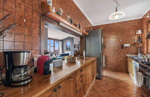 Back inside, the kitchen is semi-open, thanks to a large hatch, which connects it to the dining area. The kitchen is well-equipped with a cooker hob, oven, dishwasher, fridge/freezer and a coffee machine.