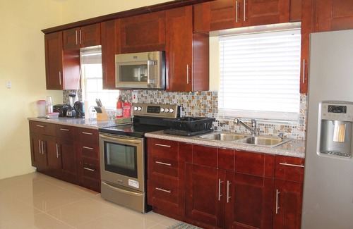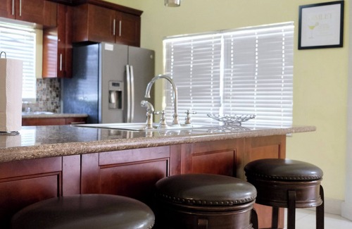 The Villa’s architectural design provides you with a feeling of space with its natural flow from the inside living area to the outside lower veranda leading to the large pool and adjoining lake. It offers the idea place to relax with a cool drink and good book or have a swim in the pool and enjoy the views of the lake and sunset. The kitchen is grand in size and is functional with two stainless steel sinks and a modern granite kitchen island. Its elegant walnut finish complemented with high end appliances gives you the perfect environment to entertain your close families and friends. The floors are all polished porcelain tiles The villa has all the necessary amenities such as a large fully equipped kitchen with stainless steel appliances, laundry facilities, wireless internet, Direct TV/DVD player, and BBQ pit.