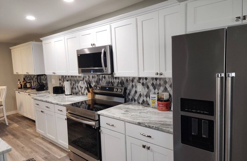 Kitchen: Large Kitchen Island w/ 4 person seating, beautiful granite, soft close cabinets, stylish rectangular table with seating for 6 and a charming 2-person bench.