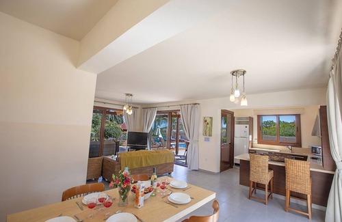 The ground floor of the villa features an open-plan living room, kitchen and dining area with patio doors leading out to the garden and pool, and offering picturesque hill and sea views. The living room provides comfortable sofas and widescreen TV; the dining area has a table and chairs to seat 6 people, and the kitchen is complete with all modern appliances and utensils needed for your self-catering stay, as well as a breakfast bar with extra seating for two people.