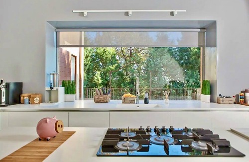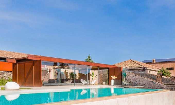 The villa boast a 30,000 sq feet manicured garden where a generous infinity edge salt-water swimming pool, complete with sunbeds and umbrellas, is the belle of the ball. Just next to it, a beautiful sun room with glass walls, a great space to enjoy when tired of sunbathing or willing to just lounge in the shade. An additional lovely terrace with an ancient well is located next to the kitchen, and it is an ideal place for having morning breakfast and dinners under the stars.From the courtyard, climbing approximately 20 steps, you will enter the sun-washed double living room with dining and sitting areas. This spacious room, with its central glass fireplace, vaulted fresco ceiling, white floor against grey walls, warm wooden table paired with canary yellow polypropylene molded chairs, boasts a timeless and fashion-forward look. The plush, white sofas act as the focal point in the space, along with the beautiful windows bringing in a lot of natural light. The modern glass fireplace and the floating shelving adds an artistic and youthful appeal. A bright and fully equipped kitchen with a central cooking island and large picture window, serves the din- ing room. A guest bathroom completes this floor.Upon reaching the top of the contemporary glass staircase, you’ll come across 4 individual double bedrooms. Each featuring their own characteristic design and furnished to perfection, you’re guaranteed to experience a comfortable night’s sleep every time. Better still, 5 stunning bathrooms also adorn this villa, each with expansive showers and spacious sink areas.