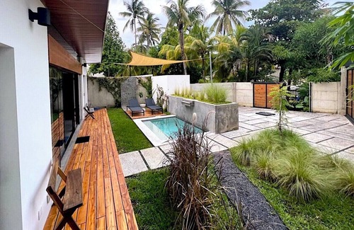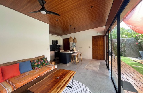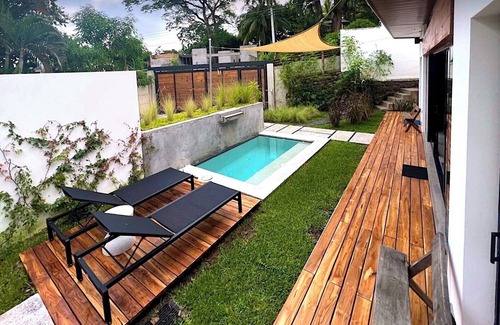 Villa Los Padrinos La Casita is a beautiful modern style bungalow in the heart of playa El Zonte. This exceptional 2bed/2bath house with a full kitchen is just a two minute walk to the black volcanic sand beaches. Enjoy amazing sunsets in a private setting with pool, a small garden and outdoor dining area. Find the perfect environment to relax, play and unwind. The property includes a private gate that leads to secure off-street parking.