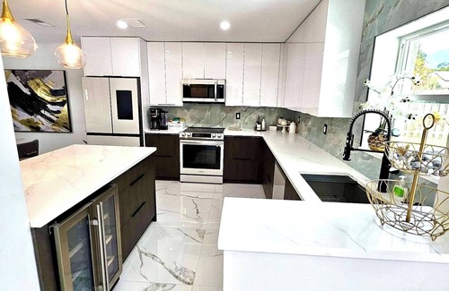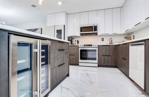The stunning open-concept kitchen features top-of-the-line, high-tech Samsung appliances, modern cabinets, and expansive quartz countertops, creating a luxurious atmosphere even while cooking. A wine cooler is conveniently located beneath the kitchen island.