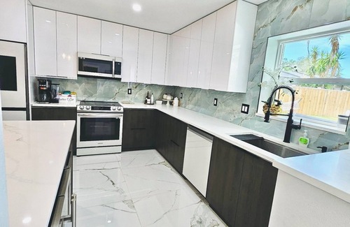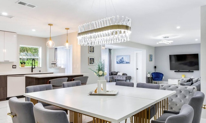 This coastal, luxurious home features a private, heated saltwater pool, designed to provide guests with the tranquil ambiance of the Florida lifestyle. The immaculate property is perfect for group getaways and family vacations, situated in close proximity to world-renowned beaches.