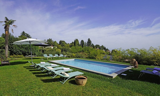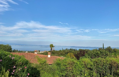 Private villa with lake view, large and bright well-kept rooms, max 10 people, private swimming pool , ac 2 rooms, tennis shared,ideal for families.Villa Madeleine is a bright villa with a unique charm, with attention to every detail, ideal for up to 10 people, located in a panoramic and exclusive residential area. The villa has a beautiful lake view from the house and from the private garden with new private swimming pool.The property is located in an elegant village made up of villas that share well-kept tennis courts, swimming pools and wonderful condominium parks with centuries-old trees, where you can relax with beautiful walks.Wi fi, astra television and garage with two parking spaces.Pets are allowed but the property is not fenced.The villa is the ideal place for a relaxing but also fun holiday and an excellent starting point for visiting Lake Garda. Villa Madeleine offers every comfort, giving those who live there warm and solar energy. The house is on two levels, on the ground floor there is the entrance, a wonderful cozy living room with a large fireplace and a large window overlooking the lake and garden with private pool, a comfortable kitchen designed in every detail connected to the external porch, 3 double bedrooms and 3 bathrooms. In the basement, there are two large double bedrooms, a bathroom and laundry. Ideal for children, there is also a large swimming pool and two perfect tennis courts in the shared park.The villa's garden is private, well-kept, flat and very enjoyable. guarantees a holiday with maximum privacy, it is furnished with an outdoor dining table, sun loungers and deck chairs.