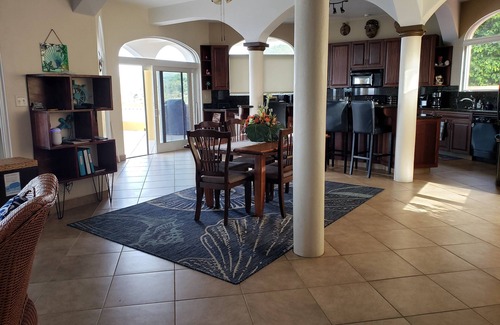 At Villa Magens, awaken to the sun rising over the cliffs surrounding Magens Bay, and fall asleep to the sound of ocean waves. Villa Magens is an exquisite home situated on a cliff over-looking the famous Magens Bay in beautiful St. Thomas, Virgin Islands. This villa has all of the accommodations of resort-style living (infinity pool over the bay, wifi, flat screen TVs with DishNetwork), but the privacy of your own home; easily accommodating all ages. This villa offers a secluded getaway on the tropical northeast side of St. Thomas. The villa embellishes beauty from the stained glass ceiling skylights to the mosaic tiled pool. The fully equipped kitchen is a chef’s delight; it has black granite countertops & splash wall, with mahogany cupboards. Every bedroom has a private bathroom with walk-in showers, large closets, and sliding-glass doors opening to the veranda. Both living rooms (upstairs and downstairs) also open to the view of the bay with sliding-glass doors, and are furnished with flat screen TVs. Lie by the infinity pool and enjoy the view extending out into the Caribbean Sea. This villa is in walking distance to the Hull Bay Beach, and a short drive to everything: Magens Bay Beach, Coral World, Mahogany Run Golf Course, Helicopter Tours, Jet Ski Rentals, etc. St. Thomas is a shopper’s paradise; from fine jewelry to beachwear.