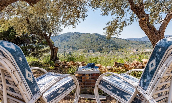 A spacious terrace in front of the house, with dining table, 3 sunbeds, and an outdoor shower. A cozy corner for relaxing under the olive trees with sitting area and a hammock, overlooking the amazing view of the lush green valley of Stafilos.
