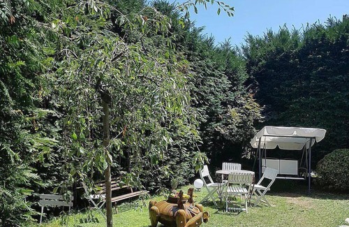 The garden is 200 square meters (2150 square feet) large. It is partly shaded by trees. The garden is equipped with a small sofa and two armchairs, as well as with tables, chairs, sun umbrellas and two swings. From the garden you will enjoy a pleasant view of the greenery. You will share the garden with the other guests staying at the complex.