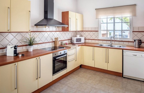 Inside, there is a spacious living room with a Smart TV including some English channels (ITV, BBC), and a large kitchen with all mod cons and a table perfect for parties of up to six people. The Master bedroom has lovely views to the pool area and hosts a king size bed and en-suite bathroom with bath. Bedrooms two (double room) and three (twin room) share a full bathroom with shower and host a queen sized bed and two single beds respectively.