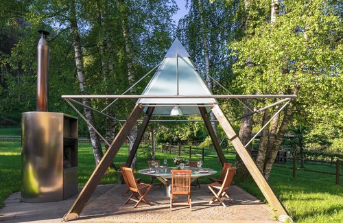 Both the interior and the large garden — complete with dining area and outdoor fireplace — ensure comfort and relaxation, even for larger groups.