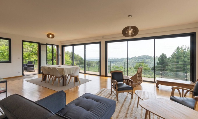 The villa Mas de Laval, which is situated in Planzolles, overlooks the nearby mountain. The 2-storey property consists of a living room, a fully-equipped kitchen, 4 bedrooms and 2 bathrooms as well as 3 additional toilets and can therefore accommodate 7 people. Additional amenities include Wi-Fi with a dedicated workspace for home office, a TV as well as a washing machine.