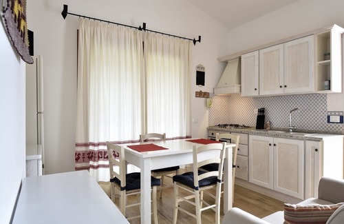 This apartment is in a recently built house, with attention to details, comfort. The bedrooms are in the back of the apartment and are spacious, cool (for the hot days) and quiet. To separate the bedrooms from the rest of the apartment, there is a small hallway, which leads to the bathroom with shower, sink, toilet, bidet. The kitchen with a view of the garden can easily accommodate 5 people. From there you can also go directly to the spacious, covered terrace. The tree 'Olivastro' provides shade. The terrace was built in typical Sardinian style by a local craftsman. There are loungers in the garden to enjoy a good book. There is also a fireplace and garden chairs behind the house. This apartment is ideal because it is practical for a family.