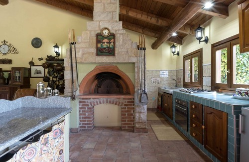 The 1000 sq m lawned garden in front of the house, with the swimming pool, is completely enclosed. It contains a few tall trees while the perimeter is planted with hedges. Next to the villa is the large porch with kitchen and wood oven, dining and living area.