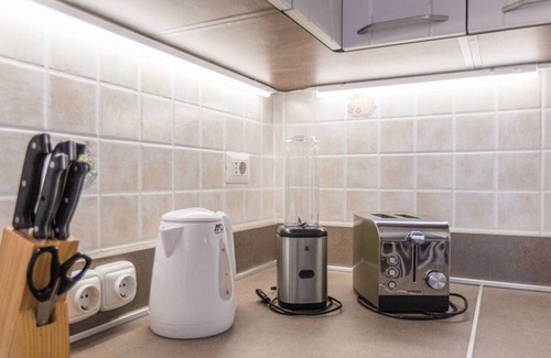 toasters, coffee machines, microwave oven, stove with oven, small and large refrigerators with
