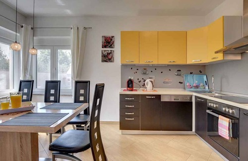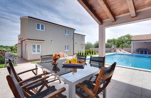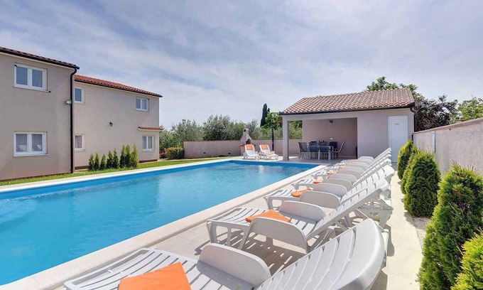 The villa built in 2011, was renovated in 2015 and is furnished in a modern and luxury style. Available for use: parasol, sun lounger, children's playground, swing, garden shower, barbecue facilities, terrace and garden furniture.LocationPula, district Valtursko Polje. The villa is located on a 936 sqm enclosed garden plot. Villa Marcelia consists of two houses, each with three bedrooms, a living room with dining area and a fully equipped kitchen. Parking (for 4 cars) is available on the property. Specialair conditioning, central heating.Facilities: internet access (WLAN) and washing machine. TV reception takes place via satellite. PoolAll pools are available for exclusive use. Outdoor pool (usable from mid May to end of September, 5 m x 10 m, depth 1,4 m). Leisuretable tennis, table football and darts. Dogsnot allowed. DistancesShopping 2 km, restaurant 100 m. In summer: Adriaitic sea 6 km in Pula (beach 8 km in Pula). DivisionVilla, 2 floors, 8 rooms (including 6 bedrooms), 326 sqm, in total 16 beds (including 4 additional beds). Room Living room with 2 additional beds on sleeping accommodation. Living room with 2 additional beds on couch/sofa, DVD player, CD player and access to the terrace (50 sqm, covered, garden furniture). 2 bedrooms each with 2 single beds. 2 bedrooms each with 1 double bed and access to the balcony. 2 bedrooms each with 1 double bed. American kitchen with dining area, electric stove (4 plates), oven, dishwasher, fridge (30 l, icebox), microwave and coffee machine. American kitchen. 4 bathrooms each with shower, 1 washbasin and WC. 2 bathrooms each with bathtub, 1 washbasin and WC. Terms of lease and pricesIncluded in the priceinternet access, dish towels (06.01.25-01.01.28), internet access (06.01.25-01.01.28), air conditioning (06.01.25-01.01.28), electricity (06.01.25-01.01.28), gas (06.01.25-01.01.28), water (06.01.25-01.01.28), heating (06.01.25-01.01.28), final cleaning (06.01.25-01.01.28), bed linen (06.01.25-01.01.28), hand towels (06.01.25-01.01.28), bathing towels (06.01.25-01.01.28). Side costs-Costs on the spot:/Obligatory:registration fee 5 € per person per stay (06.01.25-01.01.28), local tax by local tariff.Deposit:EUR 600,-/object