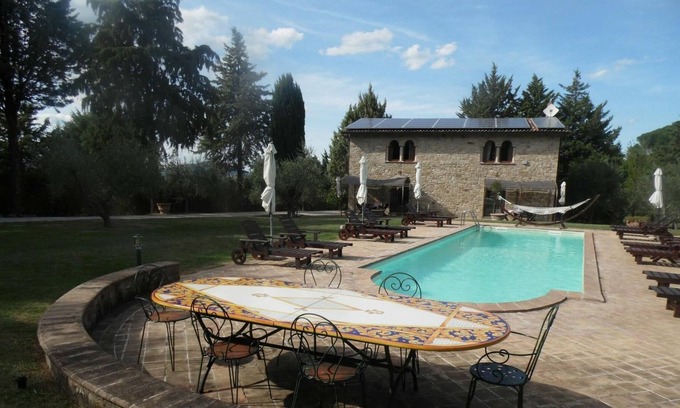 The Villa has been expertly restored in stone and precious chestnut woods with a panoramic swimming pool for exclusive use and a dream view! In a splendid green and mountainous landscape adorned with sunflowers and olive trees and offers a total of 14 total beds and is the perfect solution for families or groups of friends who want to spend their holidays together immersed in nature but still in a convenient position to reach the main tourist attractions of the region in half an hour by car such as Assisi, Gubbio, Spello, Montefalco, etc.