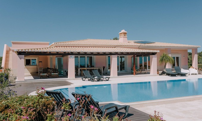 This tranquil retreat and one-of-a-kind hilltop bungalow is located in the popular area Quinta das Raposeiras. Villa Monte dos Agostos with its stunning pool area and wide ocean and mountain views will absolutely facilitate your relaxed, luxury holiday experience. The spacious single-level house showcases an Algarve panorama of ocean and mountains masterfully displayed by the living room's retractable large windows. The art -decorated main living room combines with the adjacent dining area and creates a space appropriate for elaborate entertaining, also with a romantic fireplace for wintertime. The luxury kitchen stands ready to accommodate the most discerning chef or caterer. The house includes a hallway with separate guest toilet, three bedrooms with large closets, one with separate walk-in closet. There are 2 double beds (150 m and 160 m wide), 2 large singles and 3 bathrooms, two with bath / toilet and one small, basic one with shower / toilet.The outside area is amazing, providing a large spacious swimming pool, terraces, sun beds, barbecue area, a 4th bathroom with shower / toilet and in the front of the house a large space to park your cars inside the closed gate. You have access to a roof terrace from where there are even better views than from the pool area, and where you can also enjoy the sparkling lights of Faro. Distances:Villa Monte dos Agostos is a 20-minute drive from the airport, located on the top of a large south-facing hill where only beautiful villas are hidden in the greenery. At the bottom of the hill is a tennis club with 3 courts and a padel court. A bit more down there is the renowned restaurant Raízes. All of this at 10-15 minutes walking distance from the villa.The bungalow is located between the towns of Loulé and São Brás de Alportel, where you can reach your groceries within 10 minutes by car. There are many restaurants here and in the area. The monumental covered market of Loulé and the streets around it in the old centre are popular. The most beautiful long beaches are a 20-minute drive away. Here are also the nice fishing towns of Olhão, Fuseta and a little further away from Tavira. From Olhão, Faro, Fuseta or Tavira you can hop on one of the ferries to the sandy islands in the protected lagoon landscape of the Ria Formosa. Due to its central location, the luxury Vale do Lobo and Quinta do Lago are also only a 20-minute drive away. The complete MAR Shopping with Outlet and supermarket is just a 10-minute drive away. Important information:- The house is located in a residential area with amenities like a tennis court and great restaurant around the corner. It is perfectly suited for families and friends who wish to relax and it is not suitable for party groups. No groups allowed under 25.- Neighbouring house is Villa Leonidas- All rooms except the kitchen have air-conditioning for cooling and heating.- Minimum stay: 6 nights.- Electricity including air conditioning: with normal conscious use is included.- Arrival/departure possible on any day.- Mobile Weber charcoal barbecue.- Non-smoking house.- Washing machine, 2 hairdryers, 1 baby cot and -chair available.- Beach towels available.- Dogs outside are allowed (after consultation).