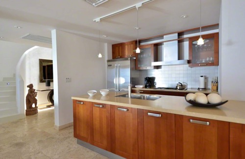 Each of the three bedrooms features a King sized bed or Twin beds with beautiful en suite marble bathrooms and oversized showers that are the last work in luxury. The master suite has French doors that slide right open and lead directly onto a balcony with spectacular views of the turquoise sea.