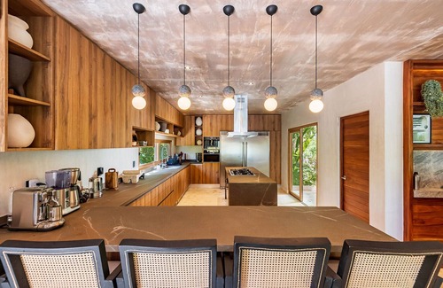Villa Naj Kan graciously accommodates up to 20 guests across its 9 expansive bedrooms. Its interior design beautifully marries the contemporary elegance of chukum style, characterized by the use of grey cement, with locally sourced wooden accents that infuse the villa with a tropical charm. The overall atmosphere is a harmonious blend of modernity and nature, with spacious open areas that seamlessly merge the ocean with the villa. A sleekly designed pool appears to merge with the horizon, offering a perfect setting to unwind and savor the breathtaking natural surroundings. Despite its secluded location, the villa provides a range of modern entertainment options, ensuring that every guest enjoys a relaxing and fun-filled stay.