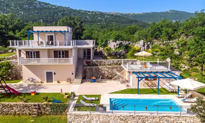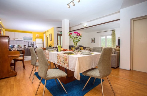 Villa Natura is located in a beautiful green oasis, in the small village of Kučiće. Peace, beautiful nature and lovely home garden with cherry trees just for your use will allow you to have a perfect relaxing vacation. Villa is suitable for 6 people, contains: 3 bedrooms, 2 bathrooms and 1 toilet, huge terraces and balconies, kitchen with living room. The outdoor space offers a large, private pool and dining area.